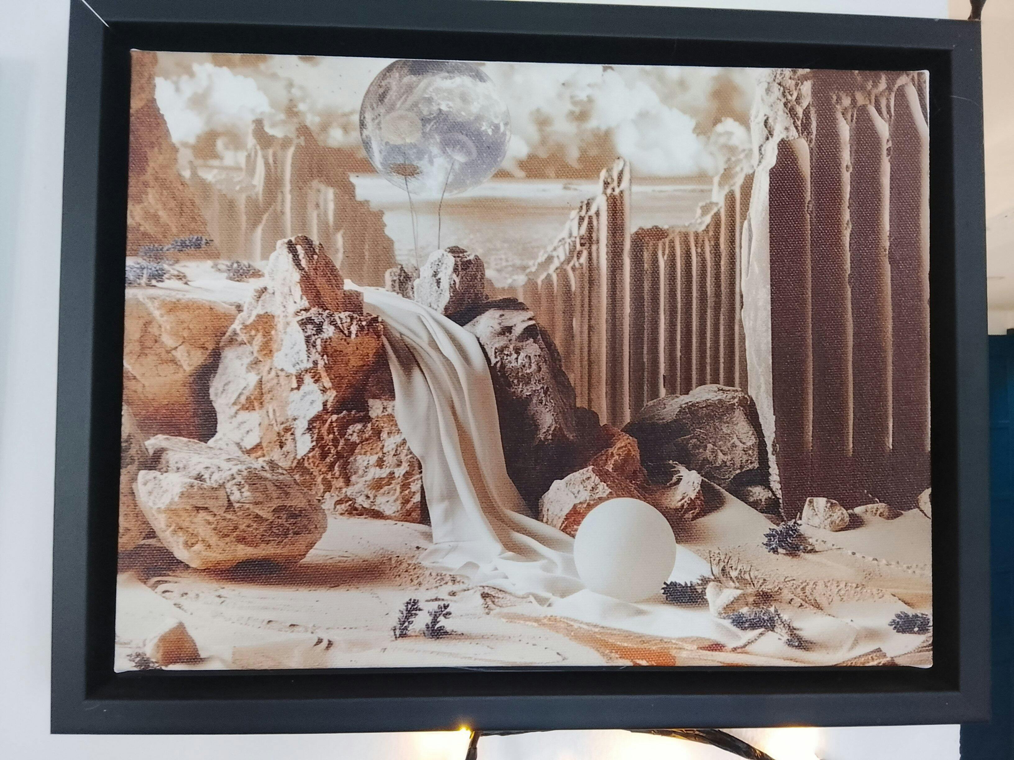 Ce tableau encadré de noir structure la rêverie. Il invite à la contemplation, à l’évasion, mais aussi à la lente élaboration d’un paysage intérieur. Il trouvera naturellement sa place dans un espace de calme, de lecture ou de réflexion.